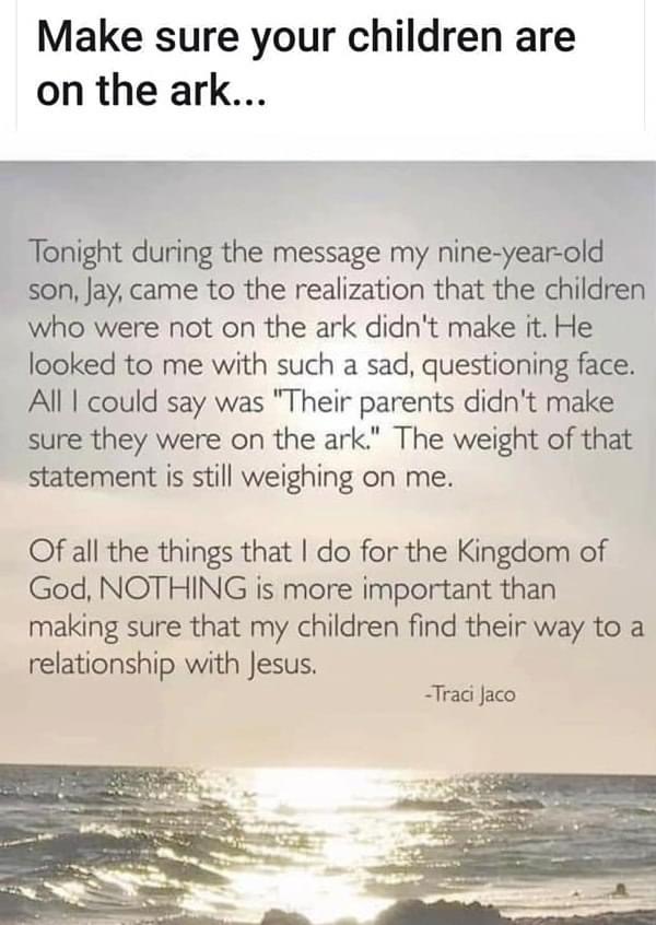 Parents, grandparents, adopted grandparents, what will make this generation of children different than all of the generations before them? – A majority of today’s parents making sure that their children will be on the ark of redemption provided through the life, death and resurrection of Jesus Christ!